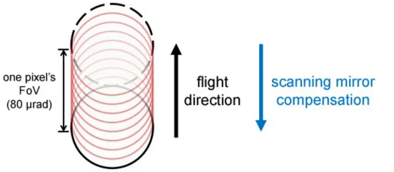 圖 2. 機(jī)載單光子激光雷達(dá)系統(tǒng)中的亞像素精細(xì)掃描。掃描反射鏡可以補(bǔ)償飛機(jī)的運動,并在數(shù)據(jù)采集過程中產(chǎn)生一個像素的 FoV 偏移。資料來源:Yu Hong, Shijie Liu等人,《Airborne single-photon LiDAR towards a small-sized and low-power payload》,《Optica》(2024)。