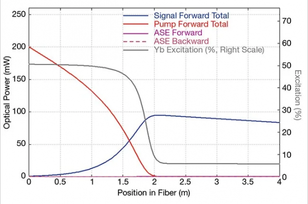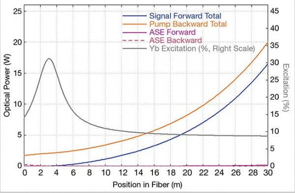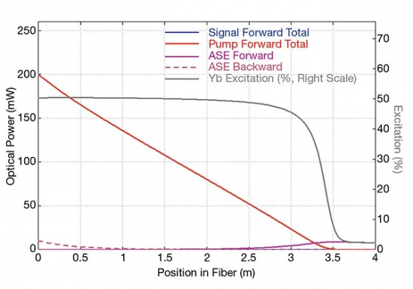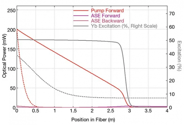 圖1還顯示了前向和后向的放大自發(fā)輻射(ASE)。前向自發(fā)輻射在光纖的其余部分被部分重吸收。這就導(dǎo)致盡管泵浦功率的殘余可以忽略不計(jì),但右端附近仍存在大量的鐿激發(fā)。