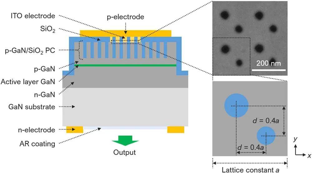 圖1:基于GaN的綠光波長(zhǎng)PCSEL的結(jié)構(gòu):(a)切割芯片的橫截面;(b)(上)去除ITO電極后,p-GaN表面光子晶體的掃描電子顯微鏡(SEM)圖像;(下)雙晶格光子晶體設(shè)計(jì)方案。