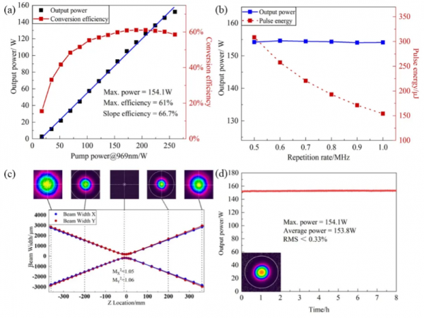 在1 MHz時,再生放大器最大輸出功率為154.1 W,光-光轉(zhuǎn)換效率最高可達61%,最高功率下的光束質(zhì)量因子為MX2 = 1.05,MY2 = 1.06,8小時功率穩(wěn)定性RMS<0.33%。