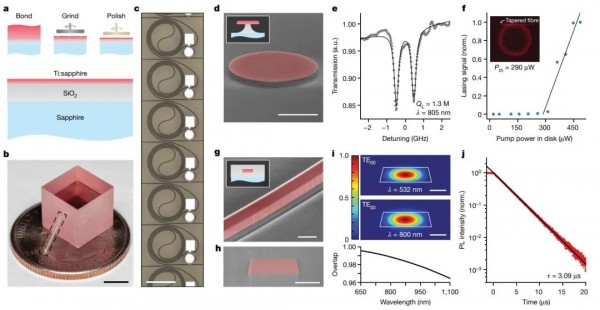 為了制造這種新型激光器,研究人員首先在二氧化硅(SiO2)平臺上制作了一層鈦藍寶石,所有這些都位于真正的藍寶石晶體之上。