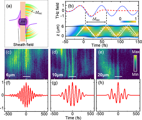 中國科學(xué)院物理研究所/北京凝聚態(tài)物理國家研究中心光物理重點實驗室特聘研究員廖國前、研究員李玉同和中國科學(xué)院院士張杰等,對超強激光與固體靶相互作用產(chǎn)生高功率太赫茲輻射的新途徑進(jìn)行了多年探索,提出了基于超熱電子束相干渡越輻射的太赫茲產(chǎn)生模型,發(fā)展了基于非共線自相關(guān)的單發(fā)超寬帶太赫茲探測技術(shù)。在上述成果基礎(chǔ)上,近日,研究人員提出了太赫茲輻射診斷超熱電子束的新方法,利用自主研發(fā)的高時間分辨單發(fā)太赫茲自相關(guān)儀,實現(xiàn)了超強激光與薄膜靶相互作用過程中超熱電子束時域結(jié)構(gòu)及動力學(xué)的原位、實時測量。該研究在理論上構(gòu)建了太赫茲輻射性質(zhì)與超熱電子束時空特征的映射關(guān)系,給出了太赫茲脈寬與電子束脈寬、束斑尺寸、發(fā)射角等參數(shù)的定量聯(lián)系。該研究準(zhǔn)確表征了激光-固體靶作用中幾十飛秒量級的超熱電子束脈寬,發(fā)現(xiàn)超強激光加速的電子束在產(chǎn)生時具有與驅(qū)動激光類似的脈寬,在傳輸過程中由于速度色散和角發(fā)散導(dǎo)致縱向時間寬度和橫向空間尺寸逐漸展寬;直接觀測到了由于激光脈沖二次加速和靶面鞘層場導(dǎo)致的超熱電子回流動力學(xué),發(fā)現(xiàn)當(dāng)高對比激光與薄膜靶相互作用后,電子束在靶前后表面鞘層場之間來回反彈,持續(xù)時間可達(dá)百飛秒量級。這些結(jié)果演示了單發(fā)、無損、原位、高時間分辨率的超熱電子表征手段,有助于理解和優(yōu)化基于超熱電子的超快輻射和粒子源時空特性并發(fā)展相關(guān)應(yīng)用。