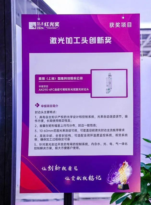 剛過去的6月,對位于松江經(jīng)開區(qū)的嘉強(qiáng)(上海)智能科技股份公司來說,可謂雙喜臨門,由上海嘉強(qiáng)申報(bào)的“ak090-4fc連續(xù)可調(diào)矩形光斑激光封邊頭”喜獲2024第七屆“紅光獎(jiǎng)”“激光加工頭創(chuàng)新獎(jiǎng)”。同時(shí),上海嘉強(qiáng)入圍 “紅光獎(jiǎng)”——激光行業(yè)影響力企業(yè)獎(jiǎng)。