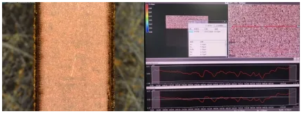 按照表1中第三組工藝參數(shù)測(cè)試表面漆層或有機(jī)絕緣層的扁銅線樣件,進(jìn)行粗糙值和溫度測(cè)試,結(jié)果如圖2所示,表面清洗干凈,無(wú)殘留,清洗前Ra值為0.72μm,清洗后Ra值為1.17μm,粗糙值略有增加,有利于焊接工藝。清洗中溫度變化范圍在29.7℃~40.6℃,該溫度范圍對(duì)材料影響較小。