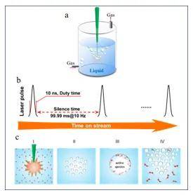 最近,中山大學楊國偉教授研究組提出了一種新穎的激光制造清潔能源技術(shù)即液相激光發(fā)泡(laser bubbling in liquids, LBL),為能源清潔轉(zhuǎn)化領(lǐng)域帶來了新的希望。LBL是以脈沖激光在液相中誘導形成微氣泡作為微反應器來進行化學反應。泡泡內(nèi)的峰值溫度可高達上萬 K,同時微氣泡能夠?qū)崿F(xiàn)快速升溫和降溫,速率可達108 K/s。這顯然是一個遠離熱力學平衡的狀態(tài),為化學反應提供了一個極端的環(huán)境。許多在常態(tài)下需要借助催化劑才能進行的化學反應,在小泡泡里面很容易就能發(fā)生。這種方法不僅不涉及任何催化化學過程(無需催化劑和復雜的催化反應裝置),而且在常態(tài)下進行,簡單、清潔、高效(圖1)。很顯然,對于在催化化學以外的常態(tài)條件下,去探索簡單、綠色、高效的清潔能源制造技術(shù)來說,LBL方法打開了一扇大門,同時,也開辟出一條超越催化化學反應的道路。目前,楊國偉教授研究組與柯卓鋒教授團隊合作將LBL技術(shù)應用于清潔能源制造,取得了一系列重要的研究進展。
