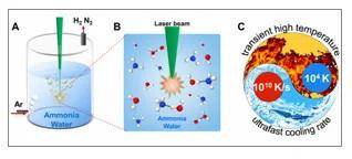 閆波博士后與李胤午副研究員和曹瑋瑋博士合作應用LBL技術(shù)發(fā)展了從氨水中超快速高效提取氫氣的新方法(圖3)。他們選取水是作為氨的液相介質(zhì)進行LBL制氫,選取水介質(zhì)過程避免了氨氣的壓縮和冷卻液化程序。他們利用LBL方法實現(xiàn)了高達33.7 mmol/h的氫氣產(chǎn)率。他們進行了第一性原理模擬計算,得出了激光誘導氨分解的可能反應路徑和反應熱力學條件。未來的研究可以進一步探索LBL方法在其他化學反應中的應用(JACS 146(2024)4864,閆波、李胤午、曹瑋瑋為共同第一作者,楊國偉為通訊作者)。