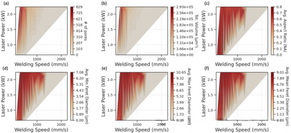 3. 等值線圖描繪了一系列工藝參數(shù)范圍內(nèi)氣孔數(shù)的變化:(a)氣孔數(shù),(b)總體積,(c)平均長(zhǎng)徑比,(d)平均最小孔直徑,(e)平均最大孔直徑,(f)平均孔直徑。