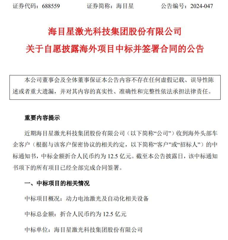8月8日晚間,海目星發(fā)布重磅公告稱,公司已于近日中標(biāo)海外頭部車企客戶的動(dòng)力電池激光及自動(dòng)化相關(guān)設(shè)備采購項(xiàng)目,合計(jì)中標(biāo)金額約12.5億元,占公司2023年?duì)I業(yè)收入的26%。截至目前,該12.5億元的中標(biāo)項(xiàng)目均已完成合同簽署。