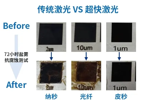 精細且精確的能量傳遞可以更好地保留不銹鋼的微觀結(jié)構(gòu),使其固有的抗腐蝕性能優(yōu)于納秒激光和光纖激光。