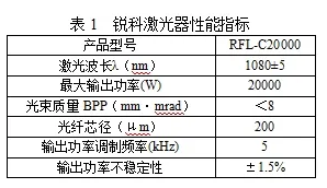 本文案例采用銳科高功率RFL-C20000連續(xù)激光器進(jìn)行復(fù)合焊接,它具備光電轉(zhuǎn)換效率高、光束質(zhì)量高、可靠性好、壽命長、免維護(hù)等特點,良好的性能為焊接的穩(wěn)定性提供了有力保證,其主要性能參數(shù)見表1。