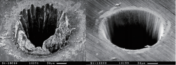 超快激光微加工和材料相互作用的時(shí)間很短,使 得能量以等離子體的形式被瞬間帶走,極大地避免了 熱熔化現(xiàn)象,熱量來(lái)不及在材料內(nèi)部擴(kuò)散,熱影響非 常小,不會(huì)產(chǎn)生重鑄層;