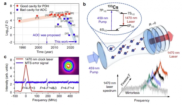 在這項研究中,激光器腔精度接近于最低極限值2。利用如此低精細的諧振腔實現(xiàn)激光,并研究其物理原理和機制,證明其在量子精度測量中的獨特優(yōu)勢,之前從未被報道過。該工作利用7.17 MHz的增益線寬,實現(xiàn)了1.2 kHz的窄線寬激光輸出,實現(xiàn)了優(yōu)于原子躍遷自然線寬3個量級的線寬壓窄效果。實驗上得到腔牽引系數(shù)為0.0148,是目前連續(xù)波主動光鐘激光器的最低值。極壞腔激光的新概念不同于傳統(tǒng)激光,這一研究成果為實現(xiàn)主動光鐘超窄線寬激光提供了新的技術(shù)途徑,有望開啟量子物理的一個全新研究領(lǐng)域。
