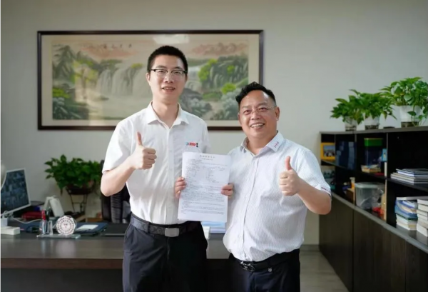 喬鋒智能簽約代表(左),崗春激光創(chuàng)始人蔣修青(右)