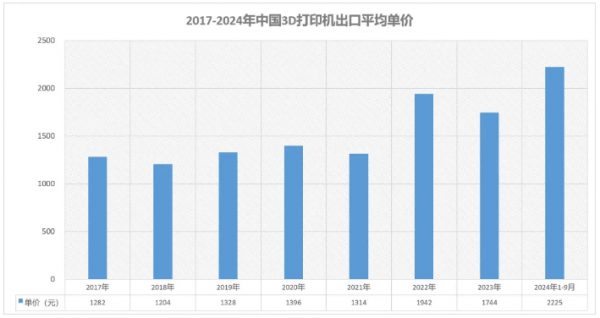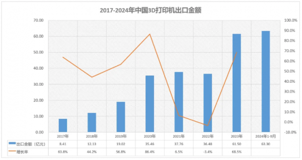 中國海關:2024年1-9月3D打印機出口284.5萬臺,金額63.3億元已超去年全年