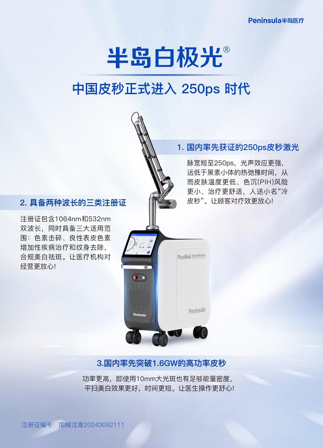 此次半島醫(yī)療獲批上市的半島皮秒激光治療儀(商品名:半島白極光),是國產(chǎn)皮秒激光領(lǐng)域發(fā)展歷程中的一個(gè)重要里程碑。
