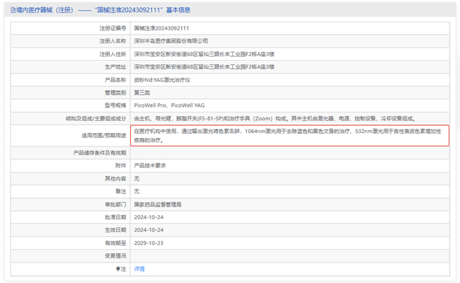 10月24日,國家藥監(jiān)局發(fā)布的醫(yī)療器械批準(zhǔn)證明文件中顯示,深圳半島醫(yī)療集團(tuán)股份有限公司關(guān)于皮秒Nd:YAG激光治療儀的注冊(cè)申請(qǐng)獲批(國械注準(zhǔn)20243092111)。