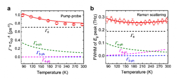 隨后的溫度依賴測(cè)量進(jìn)一步揭示了光學(xué)聲子的耗散機(jī)制。在85-295 K的實(shí)驗(yàn)溫度范圍內(nèi),隨著溫度的升高,Eg模式聲子衰減速率表現(xiàn)出極為反常的降低。該現(xiàn)象主要來(lái)源于電子-聲子散射的貢獻(xiàn),而聲子-聲子散射(如三聲子和四聲子散射)非諧作用的貢獻(xiàn)則較小。而且,時(shí)域超快(圖3a)和頻域拉曼散射(圖3b)結(jié)果的一致性驗(yàn)證了對(duì)光學(xué)聲子耗散機(jī)制的分析。根據(jù)理論模型,計(jì)算得到的電聲耦合強(qiáng)度的常數(shù)系數(shù)高達(dá)0.92,表明了PtTe2是一種良好的電聲耦合材料。