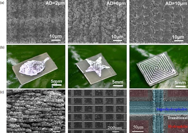圖4.(a)飛秒激光處理后PDMS表面的SEM圖像。(b)不同形狀的液態(tài)金屬圖案,如樹葉圖案、星形圖案和螺旋圖案。(c)通過飛秒激光燒蝕鈦表面獲得的方形矩陣圖案結(jié)構(gòu)的SEM圖像。