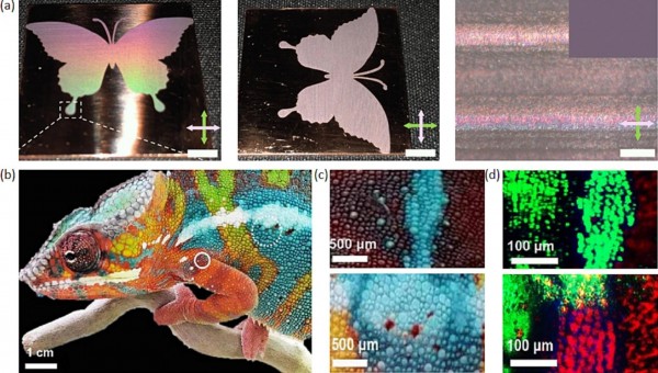 圖6.(a)從不同方位角(垂直和水平)拍攝的飛秒激光處理過的銅表面的照片和局部放大圖。 (b)變色龍的圖像。(c)變色龍皮膚的高倍放大圖像(與B中的圓圈部分相對應(yīng))。(d)仿生變色龍皮膚的全色熒光圖像。