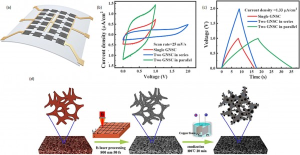 圖11.(a)柔性襯底上不同連接類型的集成石墨烯超級電容器(GNSC)示意圖。(b)GNSC在電壓掃描速率為 25 mV/s時的CV結(jié)果。(c)電流密度為0.5mA/cm2時GNSC的GCD結(jié)果。(d)CuO/Cu超級電容器的制備工藝示意圖。