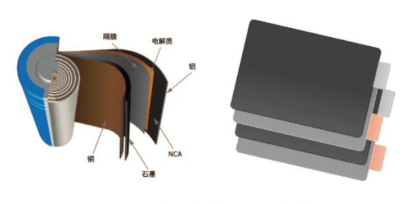 圖 1:常見的鋰離子電池結(jié)構(gòu);左側(cè)為圓柱形電池結(jié)構(gòu),右側(cè)為軟包電池結(jié)構(gòu)