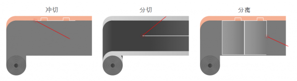 機器設計和電極制造方法以及電池單元的幾何形狀決定著切割策略,因此也是限制切割速度的主要因素。一般來說,電池箔的裁剪可采用不同類型的切割工藝:沖切、分切和分離(見圖 2)。在本文中,我們將重點關(guān)注沖切工藝,因為該工藝既可以讓我們觀察到裸露的金屬表面,也可以觀察到薄膜的整個涂覆區(qū)域。此外,這種工藝通常要求機器采用最高的卷對卷加工速度,因此是非常高效的飛行加工工藝。