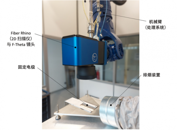 圖 7 展示了實驗配置,即將 163 mm F-Theta 鏡頭和 CW 光纖激光器搭配使用,并將其與機械臂處理系統(tǒng)相連。