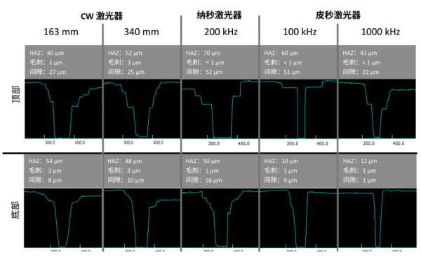 CW 激光器和皮秒激光器在高脈沖重復頻率下,在頂部產(chǎn)生的間隙最小。間隙也稱為箔片暴露。納秒激光器產(chǎn)生的間隙是 CW 激光器產(chǎn)生的間隙的兩倍。當皮秒激光器以 100 kHz 的頻率工作時,產(chǎn)生的間隙與納秒激光器產(chǎn)生