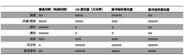 皮秒激光器的加工質(zhì)量最高。測試中所用皮秒激光器的平均功率為 45 W,使可達到的最大切割速度降至 0.65 m/s。平均功率為 200 W 的工業(yè)用皮秒激光器,切割速度應可達到 2.8 m/s。將皮秒激光器升級后,切割速度仍為 CW 激光器的十五分之一,為升級后納秒激光器的五分之一。