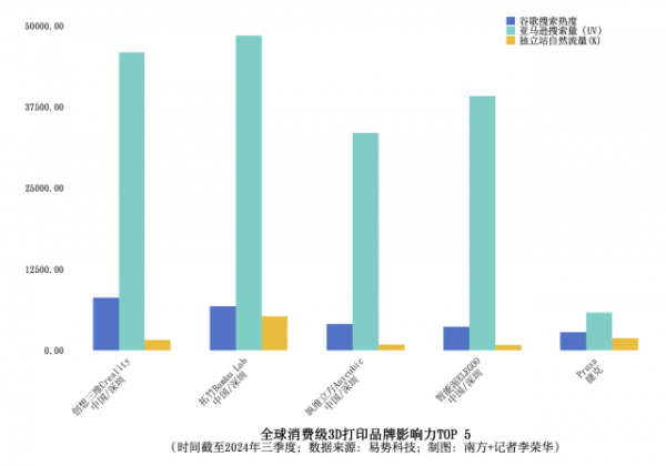 “過(guò)去幾年,深圳3D打印品牌正在全球崛起?!笨缇称放蒲芯繖C(jī)構(gòu)易勢(shì)創(chuàng)始人陳雄介紹,易勢(shì)通過(guò)分析谷歌搜索熱度、亞馬遜搜索量、獨(dú)立站自然流量等數(shù)據(jù)發(fā)現(xiàn),消費(fèi)級(jí)3D打印企業(yè)全球前5中有4家來(lái)自深圳,包含創(chuàng)想三維、拓竹、縱維立方、智能派。其中,創(chuàng)想三維在谷歌搜索熱度、亞馬遜搜索量中領(lǐng)先其他三家深圳公司,而獨(dú)立站搜索量的前五排名數(shù)據(jù)中,拓竹一枝獨(dú)秀。相比而言,獨(dú)立站因?yàn)楦碳衣?lián)系緊密,用戶黏性更強(qiáng)。