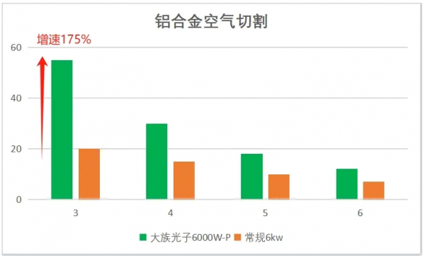 大族光子推出的6000W-P高效切割解決方案,對(duì)于厚度1~3mm板材,無論是不銹鋼、鋁合金、還是碳鋼,切割效率均優(yōu)于常規(guī)12kw的切割速度,如3mm鋁合金切割效率,增速可達(dá)57%。而4~6mm薄板,其切割速度均與常規(guī)12kw激光器切割效率相當(dāng)。