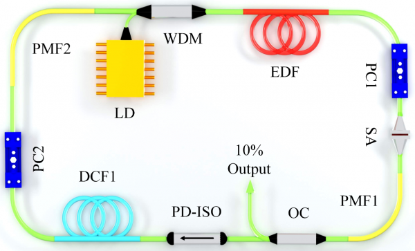 采用的雙被動混合摻鉺鎖模光纖激光器由半導體激光器(泵浦源)、摻雜光纖(增益介質)、波分復用器、隔離器、輸出耦合器組成的環(huán)形腔(諧振腔)等組成,如圖1所示。可飽和吸收體和非線性偏振旋轉的混合鎖模方式極大地提高了激光器產生鎖模脈沖的可調諧范圍,并保證了鎖模穩(wěn)定性,為實驗中發(fā)現類束縛態(tài)調Q鎖模脈沖提供了可靠的技術平臺。