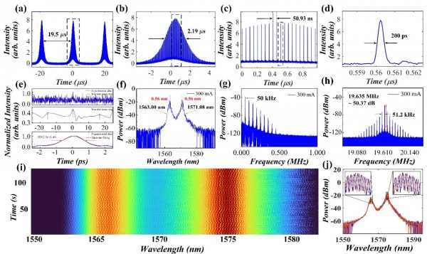 圖1所示,激光器的泵浦電流設置300 mA 時,在混合鎖模光纖激光器中觀察到了類束縛態(tài)調Q鎖模脈沖。圖2(a)-(d)展示了逐漸細化的脈沖序列。圖 2(e)中未濾波自相關軌跡及小波降噪跡線展示出束縛態(tài)雛形,證明了調Q鎖模脈沖由兩個相鄰子脈沖組成,而濾波自相關軌跡展示脈寬為 1052 fs。圖2(f)中的光譜展現束縛態(tài)調Q鎖模脈沖輸出雙波長,分別為1563.00 nm 和1571.08 nm,波長差為 8.08 nm,且在這兩個波長上都存在 0.56 nm 的束縛態(tài)調制包絡。圖 2(g)展示了類束縛態(tài)調Q鎖模脈沖的射頻頻譜,調Q包絡的重復頻率為50 kHz,掃描范圍為1 MHz,圖 2(h)則展示了相應的鎖模基頻,其鎖模信噪比為 50.37 dB。此外,測量范圍內的基頻具有多個衛(wèi)星峰,是典型的調Q鎖模頻譜。研究人員對光譜進行長時間觀測時,這種類束縛態(tài)調制隨著時間的推移而振蕩出現,如圖 2(i)所示。圖 2(j)分別顯示了第72 s和第 73 s的光譜細節(jié)。掃描時間僅相差 1 s的兩圈光譜產生了約半個周期的變化,充分展示了類束縛態(tài)調Q鎖模脈沖的振蕩行為。