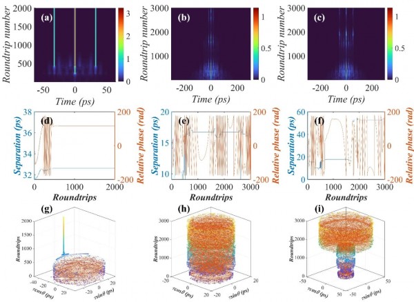 這種光譜振蕩行為證明了類束縛態(tài)調Q鎖模脈沖孤子間相位差的不穩(wěn)定性,基于此實驗結果提出了 “類束縛態(tài)”(bound-state-like)的概念,它被定義為包含兩個或更多脈沖的孤子序列,子脈沖間具有穩(wěn)定的間距但其相位差存在混沌變化。研究人員通過數值模擬復現了實驗狀態(tài),并對束縛態(tài)脈沖及類束縛態(tài)脈沖孤子間距及相位變化進行了深入對比分析。圖3展示了束縛態(tài)孤子以及兩種不同演化過程的類束縛態(tài)調Q鎖模脈沖對應的孤子間距和相位差的數值模擬結果。在圖3(d)中,脈沖穩(wěn)定后,束縛態(tài)孤子脈沖之間的間距和相位差都保持不變,與傳統(tǒng)定義完全一致。而在圖3(e)和圖3(f)所示的類束縛態(tài)脈沖中,即使子脈沖之間的距離穩(wěn)定,相位差仍會出現混沌變化。這些數值模擬結果進一步證實了作者對 “類束縛態(tài) ”概念定義的科學性。