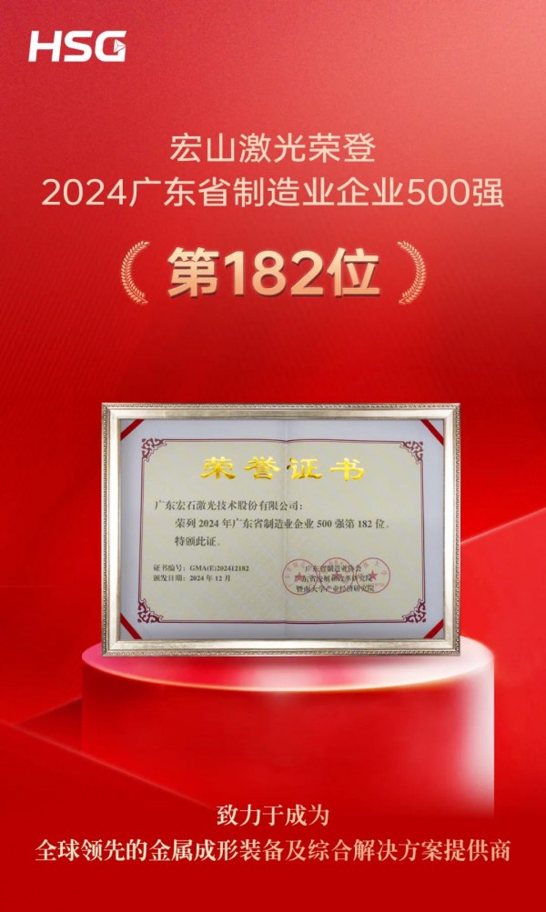 近日,由廣東省制造業(yè)協(xié)會、暨南大學產(chǎn)業(yè)經(jīng)濟研究院、廣東省發(fā)展和改革研究院聯(lián)合發(fā)布的《2024年廣東制造業(yè)500強企業(yè)研究報告》正式揭曉榜單。作為全球激光切割技術(shù)領域的卓越創(chuàng)新者之一,宏山激光憑借在智能激光制造領域的出色表現(xiàn)與穩(wěn)健發(fā)展,成功位列第182位。這一殊榮不僅體現(xiàn)了行業(yè)對宏山激光的高度認可,也彰顯了廣東制造業(yè)在高質(zhì)量發(fā)展道路上的強大潛力。