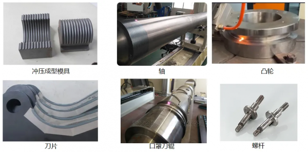 對于零件局部淬火,傳統(tǒng)加工方法為火焰淬火或感應(yīng)淬火,火焰淬火和感應(yīng)淬火均需要淬火介質(zhì),且感應(yīng)淬火需要制作相應(yīng)的工裝,對于復(fù)雜零件,其工裝制作成本和難度較大?;诖?,激光淬火有顯著的優(yōu)勢,具體見圖1。同時(shí)基于固態(tài)相變重結(jié)晶強(qiáng)化機(jī)理作用,激光淬火層硬度、耐磨性和韌性均優(yōu)其他于傳統(tǒng)淬火層。從激光淬火的市場應(yīng)用來看,該技術(shù)目前主要用于汽車模具、刃具、鋼軌、發(fā)動(dòng)機(jī)缸體等的加工,圖2為典型的激光淬火零件。