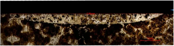 該零件材料為球墨鑄鐵,需要對表面進(jìn)行淬火,嚴(yán)格控制淬火寬度6mm-8mm,表面硬度大于30HRC,淬火層深度0.3mm-0.5mm。采用機(jī)器人搭配10mm*2mm整形光斑淬火頭以及銳科CL系列6000W(600μm)光纖激光器進(jìn)行淬火測試,淬火速度為4mm/s,激光功率1200W。