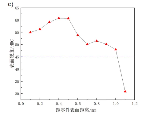 a)淬火后表面狀態(tài) b)金相法檢測淬火層深度 c)硬度法檢測淬火層深度