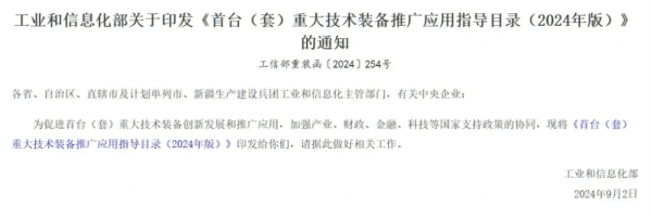 2024年9月9日,工業(yè)部和信息化部發(fā)布了最新的《首臺(tái)(套)重大技術(shù)裝備推廣應(yīng)用指導(dǎo)目錄(2024年版)》(以下簡(jiǎn)稱(chēng)《目錄》)。