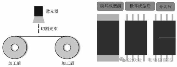 在模切過程中由于存在模具損耗快、換模時間長、靈活性差和生產(chǎn)效率低等問題,很容易引起工藝不穩(wěn)定,導(dǎo)致極片裁切品質(zhì)不一致,引起電池性能下降。而激光模切由于無振動偏差,精度高,穩(wěn)定性好以及不需要更換模具等優(yōu)點(diǎn)已經(jīng)開始逐漸成為鋰電池制造過程中的主流,常被用于極耳切割成型、極片分切以及隔膜分切等工序。