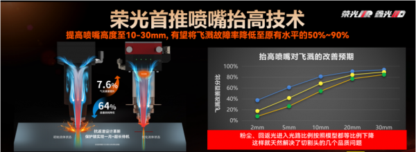 根據(jù)創(chuàng)鑫提供的2024年的激光器返修數(shù)據(jù)來看,由于噴嘴發(fā)燙、鏡片污染以及回光燒壞切割頭和激光器的故障的占比高達90%。對癥下藥,創(chuàng)鑫此次推出榮光系列,采用其獨創(chuàng)的“生發(fā)膏”技術,這也是業(yè)界獨創(chuàng)全軌跡抬高噴嘴滑行切割,開啟行業(yè)全新的第二條切割工藝路線。