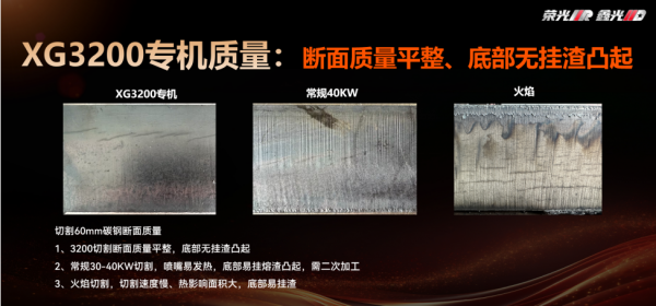 本次發(fā)布的XG3200是業(yè)界獨創(chuàng)針對船舶行業(yè)專用解決方案,開啟了行業(yè)全新的專機專用定制路線。船舶行業(yè)厚板使用常規(guī)激光正焦切割時,切割件底部易熔渣凸起、切割工件錐度大等影響出品。XG3200專機基于紫笛數(shù)字光斑平臺,進行了厚碳鋼切割能量仿真,獨創(chuàng)“多槍激光”能量模型,超越常規(guī)激光切割質(zhì)量和效果,解決了超高功率光纖激光器厚板切割斷面質(zhì)量和錐度的問題。