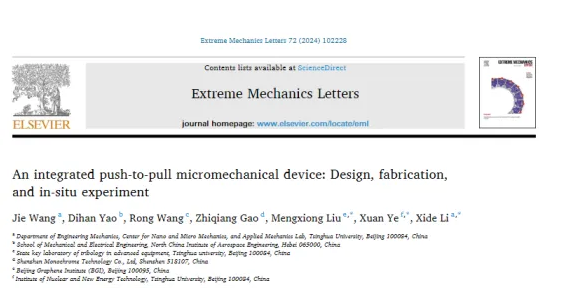 最近,清華大學(xué)的研究團(tuán)隊(duì)在《Extreme Mechanics Letters》上發(fā)表的論文《An integrated push-to-pull micromechanical device: Design, fabrication, and in-situ experiment》中,展示了一種集成的推拉式微機(jī)械裝置,該裝置的設(shè)計(jì)、制造和原位實(shí)驗(yàn)為微納米尺度機(jī)械實(shí)驗(yàn)提供了新的可能性。