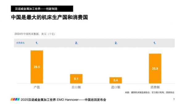 2024年,中國(guó)機(jī)床總產(chǎn)值約為290億美元,位居世界前列,是全球第一大生產(chǎn)國(guó)。機(jī)床出口約占總產(chǎn)量的29%,主要客戶(hù)群體分布于電氣、機(jī)械工程和汽車(chē)行業(yè)。對(duì)于金屬加工企業(yè)而言,機(jī)械工程和汽車(chē)制造行業(yè)是其核心需求方,因此也是EMO的主要專(zhuān)業(yè)觀眾。