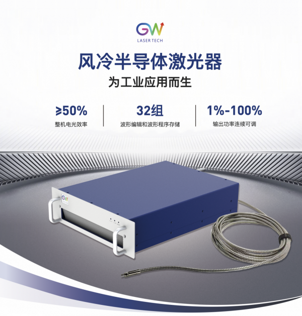 GW光惠激光最新推出的風(fēng)冷半導(dǎo)體激光器,采用先進(jìn)的風(fēng)冷技術(shù),無(wú)需復(fù)雜的水冷系統(tǒng),,降低使用成本,輕松實(shí)現(xiàn)長(zhǎng)時(shí)間穩(wěn)定運(yùn)行。同時(shí),支持功率從1%到100%調(diào)節(jié),靈活適應(yīng)不同加工需求,從精細(xì)微加工到高功率切割,一機(jī)搞定。支持32組波形編輯與存儲(chǔ),自定義激光輸出,快速切換任務(wù),滿(mǎn)足多樣化高精度加工需求。