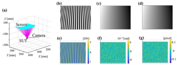圖2 偏折系統(tǒng)不確定性建模。(a)系統(tǒng)配置,(b)強(qiáng)度,(c)相位,(d)逆向追跡的屏幕像素,以及它們對(duì)應(yīng)的噪聲分布(e)-(g)