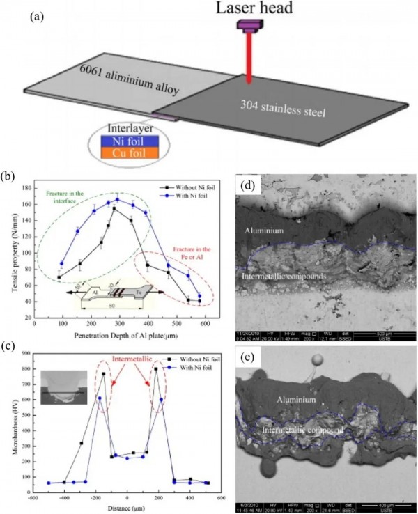 圖5(a)鋁鋼激光焊接示意圖;(b,c)接頭拉伸性能與顯微硬度;(d,e)未添加/添加Ni箔的斷口形貌