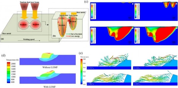 圖12(a,b)雙光束焊接原理;(c)瞬態(tài)小孔模型;(d)有無磁場時(shí)熔池截面溫度曲線;(e)磁場下熔池流體流速
