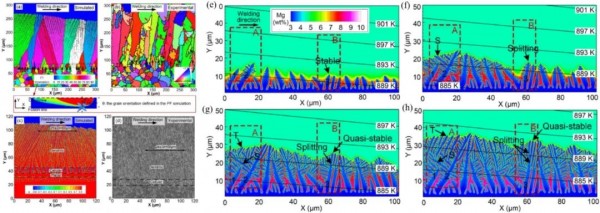 圖13(a~d)晶粒/亞晶結(jié)構(gòu)的模擬與實(shí)驗(yàn)對比;(e~h)胞晶向枝晶的演化過程