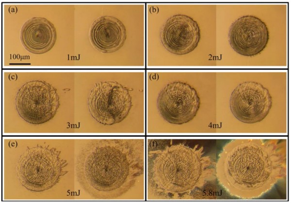 圖6. 不同激光脈沖能量下的微觀結(jié)構(gòu):(a) 1 mJ;(b) 2 mJ;(c) 3 mJ;(d) 4 mJ;(e) 5 mJ;(f) 5.8 mJ[6]。